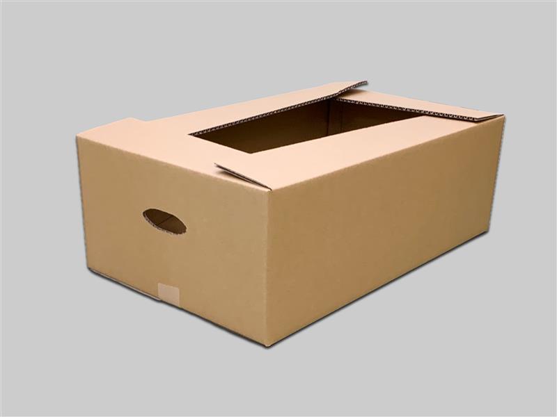 テープ等を使用せずに箱の封緘ができる軽量農産物用段ボール箱。底面は通常の段ボール箱と同じ手順で折り曲げると卍状に重なり支え合う構造に組まれ、底抜けしない強度を確保できる。天面は1箇所を差し込む事で封緘を可能にし、開封しやすい形状によって梱包作業性を向上させる特徴を持つ。